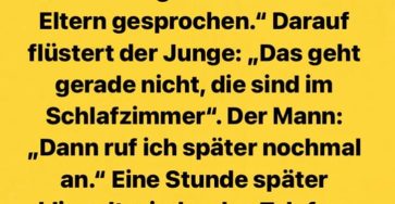 Das Telefon klingelt, Fritzchen geht dran und flĂŒstert: „Hallo?“ sagt ein Mann, „Ja, ich hĂ€tte gerne mal deine Eltern gesprochen.“…